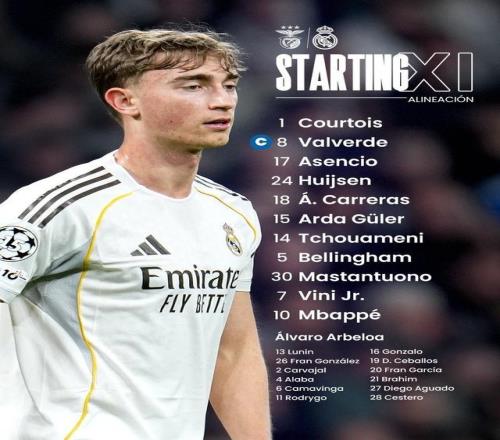 皇家马德里首发:1-库尔图瓦、8-巴尔韦德、17-阿森西奥、24-赫伊森、18-卡雷拉斯、15-居莱尔、14-楚阿梅尼、5-贝林厄姆、30-马斯坦托诺、7-维尼修斯、10-姆巴佩